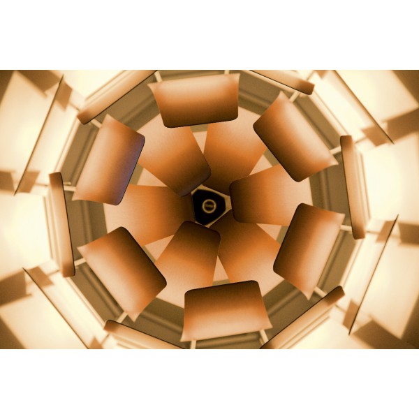 Matériaux: Lamelles: Cuivre poinçonné et brossé. Abat-jour: Acier blanc. Support: Acier chromé, haute brillance. Support : Aluminium chromé, haute brillance. Câbles: textile blanc et inox